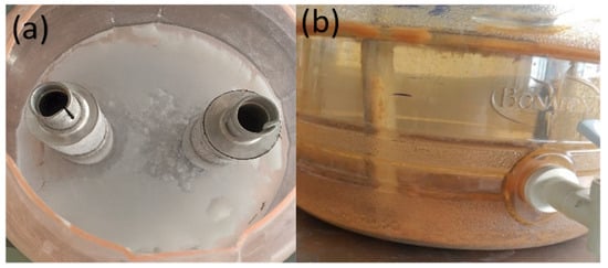 Electroreactor of polypropylene with 8 L volume for mine water electrocoagulation using two different electrodes: (a) aluminum electrodes and (b) stainless steel electrodes.