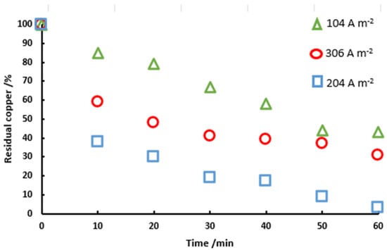 This may be due to the polarization of the electrode, since from 30 min onwards the percentage of residual copper remained relatively similar for the 306 A/m2 charge density. It is known that polarization increases with the charge density [].