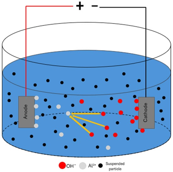 On the other hand, mine process water contains organic particles added in the grinding and flotation processes, including necessary chemical reagents such as collectors, foaming agents, and conditioners, which cannot be completely removed using only the clarification process. However, the electrocoagulation process has been shown to be efficient for agglomerating suspended particles in water []. In this sense, turbidity is a measure of the clarity of a liquid, measuring the light that is trapped by the material suspended in the water. In turn, turbidity increases when matter agglomerates, increasing turbidity and generating larger particles. The scheme of this process is shown in Figure 3, beginning with the electrolytic dissolution of the anode (aluminum) (Equation (1)) to form cationic aluminum, in addition to the formation of the hydroxide ion at the cathode through the hydrolysis of water and in the presence of suspended particles, where the hydroxide ions and aluminum ions are attracted by charge forces between them (Yellow arrows in Figure 3) for forming aluminum hydroxide.