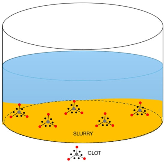 In this regard, Von Smoluchowki’s model is frequently used to explain the kinetics of sedimentation through the actions of certain concentrations of electrolyte solutions (Equation (20)) []. In this model, it is proposed that the coagulating electrolytes compress the electrical double layer, which leads to a decrease in the repulsion forces between the colloidal particles, which unite upon collision to form binary and tertiary clots, and so on [,,,,,,,,,,,,].