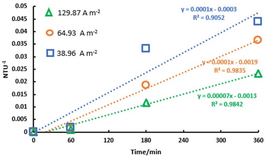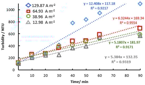 A proportionality between the change in turbidity (NTU) and time was observed. The turbidity (NTU) of the water at different times and at different current densities is plotted in Figure 6, where an acceptable adjustment of the model to the experimental data can be seen. It can be seen that the process follows zero-order kinetics, and the current density has a more considerable effect.