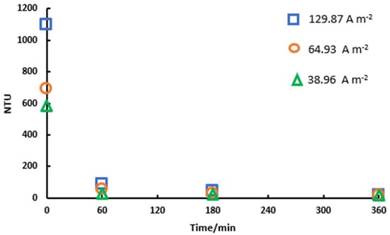 As established above, the clarification of water consists of two stages: electrocoagulation and settling. Electrocoagulation is where colloidal particles come together to form clots, increasing their weight and sediment through gravity. Figure 7 shows the turbidity (NTU) vs. time after the electrochemical treatment, demonstrating a drastic decrease 60 min after suspending the electric current and reaching NTU values of 15.72, 15.57, and 14.79 for 129, 64.23, and 38.96 A/m2, respectively, after 360 min of electrotreatment. This emphasizes that at lower current densities, due to the reduced current, fewer NTUs are formed, and the sedimentation of the clots is favored. In this sense, it has been found that there is an optimal current density in the water clarification process; once that value is reached, no improvement in solid removal efficiency is seen [,].