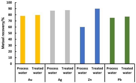 One of the principal goals of the electrochemical treatment of mining water is to increase the efficiency of metal recovery. Precious metals (Au and Ag) are of major interest and can be recovered via flotation. Flotation tests were carried out on both untreated process water and treated water. Figure 12 shows the recovery percentages of Zn, Pb, Au, and Ag in both water samples; it can be observed that, in the treated water, the recovery of Au and Ag increased by around 1.5%. This may not appear to be a large difference, but in industrial quantities of water, it is considerable, as the recovery of Zn from treated water was as high as 90% compared to only 60% recovery in untreated water, thereby establishing that electrocoagulation has a positive effect on metal recovery through flotation. In the case of lead, no considerable difference was observed.