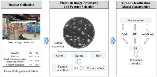 In recent years, the sustained growth of China’s economy has significantly boosted the demand for copper, further consolidating its leading position in the global copper consumption market []. However, numerous challenges are faced by China in the development and utilization of copper resources, including the ubiquity of low-grade deposits, the limited reserves of high-grade ores, and the relatively lagging technological and scale development []. Froth flotation, a mineral processing method based on the differences in the physical–chemical properties of mineral surfaces to separate fine-grained associated or mixed minerals, has always played a crucial role in the separation and recovery of copper ores []. In practice, due to the complexity of the flotation process, the variety of influencing factors, and their high interdependence, the majority of beneficiation plants still rely on experienced workers to judge the grade of concentrate by observing the shape, color, and texture of the foam. This experience-based operation has drawbacks such as strong subjectivity, low identification efficiency, and difficulties standardizing evaluation criteria [,]. To improve this situation, some beneficiation plants have begun using X-ray fluorescence analyzers to measure the grade of concentrates, but the accuracy of this method is inevitably affected by factors such as the particle size and moisture content []. Therefore, researching and developing rapid, intelligent, and automated grade detection methods is of great significance for optimizing flotation process control and improving product quality.