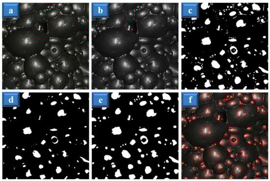 Otsu foam image segmentation. (a) Original image; (b) grayscale; (c) binarization; (d) erosion; (e) dilation; (f) boundary drawing.