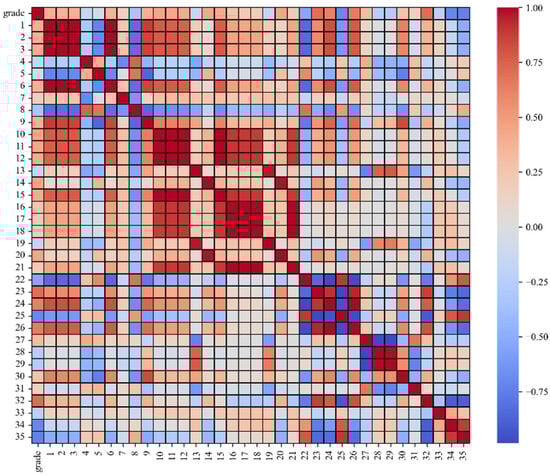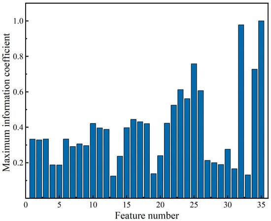 Table 1 details a total of 35 foam features that were collected through feature extraction, organizing them from 1 to 35. However, an excessive number of features can lead to information redundancy and even interference among features, potentially compromising the accuracy of the predictive model. Consequently, selecting the most relevant features and reducing the number of feature dimensions are critical steps in developing an accurate predictive model for the concentrate grade. To achieve this, this study employs a combined correlation feature selection method for data dimensionality reduction, ensuring a balance between interpretability and predictive accuracy. Specifically, the Pearson correlation coefficient and the maximal information coefficient are used to comprehensively assess the correlation between image features and concentrate grade, thereby filtering the original feature set. The Pearson correlation coefficient quantifies the linear correlation between features and the target variable. Meanwhile, the maximal information coefficient focuses on both linear and nonlinear relationships, effectively capturing complex feature associations by measuring the maximum shared information between variables.
