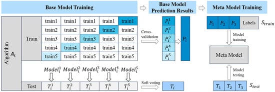 In this formula, represents the model trained by the -th algorithm during the -th cross-validation, using the training set while excluding the validation subset . Here, [1, 3] represents the three base models, and [1, 5] denotes the five iterations of cross-validation.