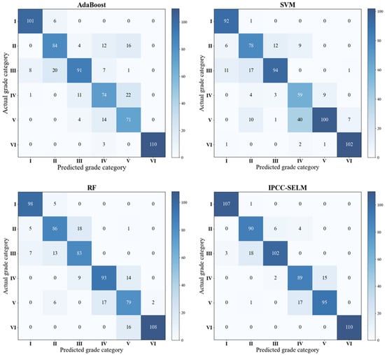 Furthermore, Table 4 displays the performance metrics, comparing the IPCC-SELM model with the single models. In terms of precision, the IPCC-SELM model outperforms the SVM, RF, and AdaBoost models in all grade categories. Regarding recall, the IPCC-SELM model outperforms the other models in the ultra-high-, slightly high-, normal-, and ultra-low-grade categories. However, the PRE of the IPCC-SELM model is 80.91% and 86.36% for the slightly low- and low-grade categories, which are, respectively, lower than that of the RF and SVM. This may be due to the significant similarity in feature expression among samples in the slightly low- and low-grade categories, making it difficult for the base models to accurately differentiate these samples. The confusion matrix in Figure 6 reveals that the SVM, RF, and AdaBoost models do indeed exhibit numerous instances of mutual misclassifications in the slightly low- and low-grade categories. Since the ensemble model relies on the predictions of base models as inputs, the poor performance of the base models in these categories with complex feature relationships may directly impact the performance of the ensemble model.