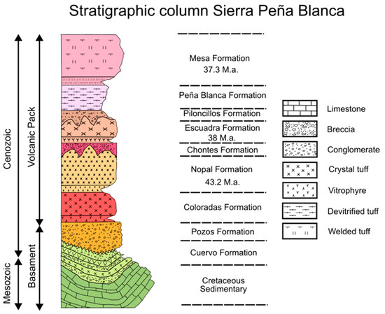 The Sierra de Peña Blanca (SPB) is a fault-block mountain range located 70 km northeast of Chihuahua city, with UTM coordinates of 395,508 east and 3,223,656 north, in zone 13R. The mountain range is about 100 km long in a north–south direction, with a width of up to 15 km, and presents many faults and fractures, resulting in an irregular and abrupt topography. Tectonic activities there have led to the formation of an ignimbrite pile, which was significantly enriched with uranium mineralization. The Peña Blanca uranium district hosts about 40% of the Mexican uranium reserves and consequently has garnered much interest for its geological–mineralogical characteristics. The uranium deposits are stratigraphically controlled in these volcanic rocks, mainly rhyolitic tuffs, and in the underlying Cretaceous rocks, with or without additional mineralization processes. Some of these main ores and their specific mineralizations are known as Nopal I, Puerto III, Domitila, and Margaritas [16].