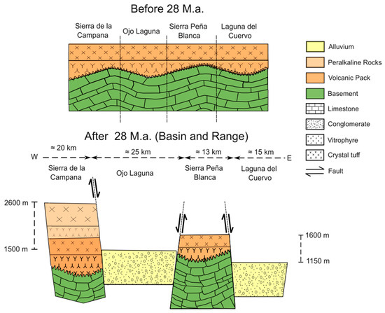 More than 28 M.a., (top) the terrain had similar elevations across the different sections (volcanic rocks resting discontinuously on the basement). After the formation of the Basin and Range Province (bottom), a series of blocks developed along the terrain and the deposition of peralkaline rocks occurred on the volcanic pack in the Sierra de la Campana block. The difference in elevation generated a hydraulic gradient, which induced the erosion of the peralkaline rocks containing U, and consecutively produced a flow of sediments (from west to east) rich in U, which finally concentrated SPB. Modified from Goodell [18].