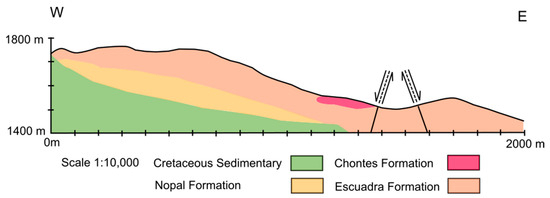 Geological profile of the Margaritas mine. The thickness of the Chontes formation is irregular because it was deposited in a pre-existing topography, filling streams. The distance 0 m is equivalent to UTM coordinates 394,841 east 3,222,152 north. The mineralized zone of the Margaritas mine is located in the block delimited by the two faults described. Modified from [29,30].