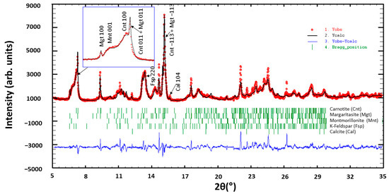 The interpretation of the XRD patterns in Figure A1 presents some difficulty as the different phases produced significant peak broadening and peak overlap. The broadening of XRD peaks, in general, is a result of the deviation of the observed structures from the perfect crystal model. The most frequent imperfections are the small size of the crystallites and the non-homogeneity (in dimensions and/or contents) of the unit cells. The structures of the margaritasite–carnotite, the clays (montmorillonite), and the feldspars present in the mineral are such that they generate important clusters of broadened maxima in the environments 2θ ≈ 13°, 20°, and 25°–28° (for Cu-Kα radiation). Particularly interesting is the complex of unresolved signals around 2θ = 13°. This cluster of maxima is produced by the (1,0,0) and (0,1,1) plane families of the margaritasite and carnotite phases (both of the same space group P1 21/c1) and by the (0,0,1) family of montmorillonite. The sharp peak at the lowest angle (2θ = 12°) provides information about the lattice parameter a of margaritasite. The rest of the signals in this package would have to be acquired with a better angular resolution to be interpreted. In fact, the Rietveld refinement that led to the results compiled in Table A1 was performed based on the high-resolution XRD interpretation as described in Section 5.1.2 of the manuscript.