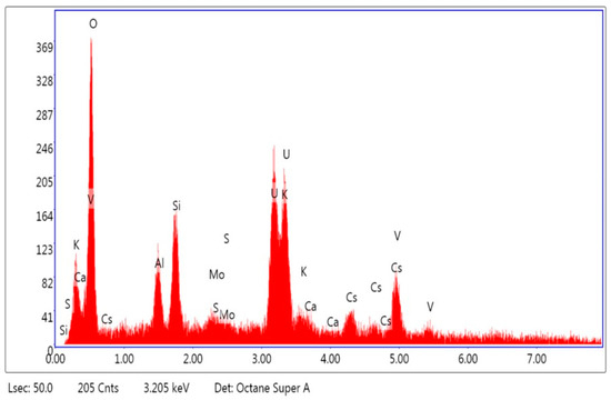 Figure 9 and Table 5 report on the EDX fluorescence spectrometry results linked with the micrograph presented in Figure 8. The elements that were detected are U, O, K, Cs, and V, which is fully consistent with the chemical composition of the margaritasite–carnotite crystals that was revealed by XRD.