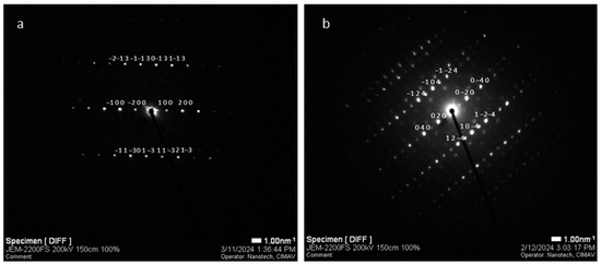 SAED patterns from nanocrystals of margaritasite–carnotite particles. Representative diffraction spots are indexed according to (a) zone axis 0,3,1 and (b) zone axis 4,0,1.