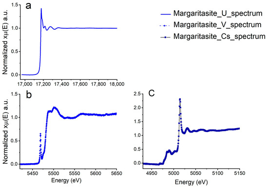 Margaritasite XANES spectra obtained at different edges. (a) U L3-edge (obtained in fluorescence mode). (b) V K-edge (obtained in fluorescence mode). (c) Cs L3-edge (acquired in transmission mode). A spectrum was observed in the pre-edge zone, corresponding to the excitation of titanium impurities present in the natural mineral.