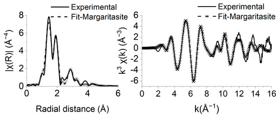 The appropriate strategies described in [57] were applied to theoretically model the spectra in terms of wavenumber k and Fourier transform for the uranyl compounds. The simulation of theoretical EXAFS spectra was undertaken using the Artemis module of the Demeter software package and benefits from the knowledge provided by the structural data obtained by XRD on margaritasite and carnotite. One can logically assume that an adequate fit for the experimental EXAFS spectrum enables the elaboration and verification that the model for the crystalline phase under study is correct. In Figure 12, the Fourier transform and k3-weighted spectra retrieved from the margaritasite’s U L3-edge EXAFS spectra are reported. The features of the radial distribution function at ~1.1–1.8 Å were properly fitted by considering two axial oxygen atoms at a bonding distance of 1.79 Å (2U-Oax) and five equatorial oxygen atoms at a bonding distance ~2.17– 2.42 Å (5U-Oeq), respectively. These distances are consistent with those obtained via Rietveld refinement on XRD data (Table 3). The best fit parameters for the simulated EXAFS data are summarized in Table 6.