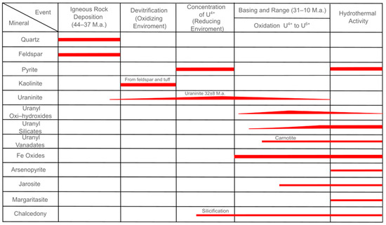 The SPB uranium district underwent a series of hydrothermal activities, which altered the rock and the uranium minerals. After the folding of the basal rocks layer, the volcanic pack was discordantly generated in the Peña Blanca uranium district between 44 and 37 M.a. [27]. These volcanic rocks are contemporaneous to the Superior Volcanic Series. Subsequently, a regional extension event induced the formation of the Basin and Range Province (31–28 M.a.). At the same time, peralkaline rocks were emplaced from the Nido Block to Texas. Tectonism engendered a stepped slope from west to east, resulting in a hydraulic gradient that allowed, together with meteoric water, the movement of uranium through the clastic and volcanoclastic sedimentary horizons, from the Nido Block, crossing the Encinillas Basin, to the uranium district of Peña Blanca, where the uranium was reduced thanks to favorable conditions allowing it to precipitate and/or to concentrate.
