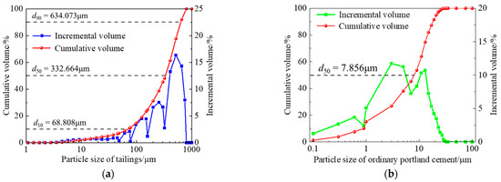 Particle size distribution characteristics of materials: (a) tailings; and (b) cement.