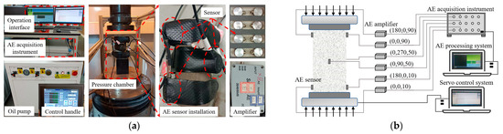 Experimental hydraulic press and AE equipment schematic diagram: (a) YAW-600 hydraulic press; and (b) AE Equipment.