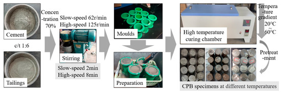 During the experiment, a fixed cement-to-sand ratio of 1:6 and a concentration of 70% were maintained. Standard cylindrical specimens with a diameter of Φ50 mm × H100 mm were prepared following the procedure depicted in Figure 4. The sampling principle of “dry mixing followed by wet mixing” [31,32] was employed. Firstly, the cement and sand were mixed in the proper proportions and thoroughly stirred. Then, an appropriate amount of water was added. A JJ-5 cement mortar mixer was used, with low-speed stirring for 2 min and high-speed stirring for 8 min. After achieving a uniform mixture, it was poured into the mold to prepare the standard specimens. After 48 h of curing inside the curing box, the specimens were de-molded, and the ends were polished to ensure a surface roughness of less than 0.02 mm. The curing box temperature was varied for the experiment at 20, 30, 40, 50, and 60 °C, with a controlled temperature deviation of ±1 °C at each temperature. The curing times were set at 3, 7, 14, and 28 days. Three specimens were prepared for each set of conditions, and the average value of the experimental results was used for final analysis and research. With this arrangement, the experimental errors were reduced.