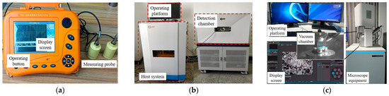 Main experimental equipment: (a) non-metallic ultrasonic testing analyzer; (b) NMR analyzer; and (c) field emission SEM equipment diagram.