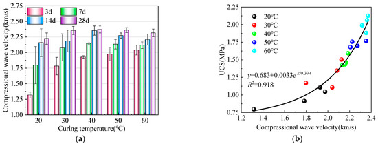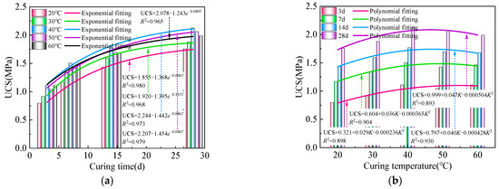 Variation patterns of UCS of specimens: (a) in relation to curing time; and (b) in relation to curing temperature.