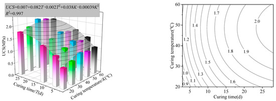 Considering the effects of curing time and curing temperature on the UCS, the three-dimensional UCS diagram and contour map were drawn as shown in Figure 7. The uniaxial compressive strength increases with the increase of curing time. It shows a trend of first increasing and then decreasing with increasing curing temperature. The contour lines in this figure show that when the curing time is relatively low, the contour lines are almost perpendicular to the curing time, indicating that during the early maintenance of the CPB, the curing time significantly impacts strength. At the same time, the influence of temperature is relatively minor. This indicates that the initial development stage of CPB strength is more sensitive to curing time.