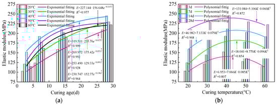 Variation patterns of elastic modulus of specimens: (a) in relation to curing time; and (b) in relation to curing temperature.
