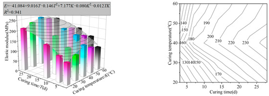 Similarly, considering the combined effect of curing time and curing temperature on the elastic modulus of the CPB, the three-dimensional elastic modulus diagram and contour map were drawn, as shown in Figure 9.