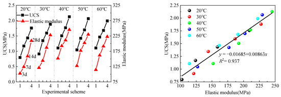 Figure 10 characterizes the relationship between UCS and elastic modulus at different curing temperatures, and shows a correlation fitting analysis. It can be seen that under different conditions, the UCS and elastic modulus have a consistent change law, and both increase with an increase in curing time, and show a trend of first increasing and then decreasing with the increase of curing temperature. The results showed that the correlation coefficient between the UCS and the elastic modulus was 0.937, which followed the linear regression equation UCS = −0.01685 + 0.00863E, and had a good correlation.