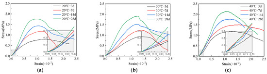 Observing Figure 11f, it can be noted that an increase in the curing temperature causes the stress–strain curve to shift forward during the compaction stage. Higher temperatures lead to a more pronounced linear increase in the stress–strain curve, indicating a more prominent linear elastic behavior. During the failure process, the varying degrees of the hydration reaction result in differences in strength. When the curing temperature exceeds 40 °C, the excessively high temperature accelerates the hydration reaction, impeding the complete hydration of the cementitious material. As a result, the stress–strain curve exhibits a faster initial growth rate, but lower strength.