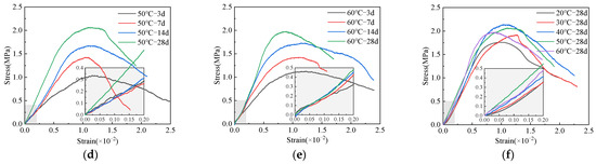 Stress–strain curves of CPB under different curing conditions: (a) 20 °C; (b) 30 °C; (c) 40 °C; (d) 50 °C; (e) 60 °C; and (f) 28 d.