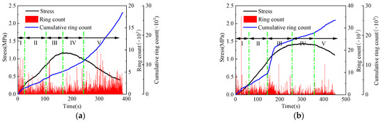 Comparing the cumulative ring count at different curing times for the CPB at each stage (Figure 13a), it can be observed that the cumulative ring count increases with the increase in curing time. As a result of the increased strength of the CPB, a relatively larger number of microcracks were generated during the process of failure, leading to an increased friction effect between the internal particles. Therefore, the cumulative ring counts detected by AE before failure increased with the increase in the curing time, showing an increasing trend in all stages. However, in Stage IV, the cumulative ring counts showed a decreasing trend. This result was mainly due to the incomplete hydration reaction of the CPB under low curing time, resulting in higher ductility. This can also be observed from the stress–strain curve, which showed a slow and gradual change after failure without a rapid decrease. On the other hand, under high curing time, the specimens gradually transformed from ductile to brittle, and after failure, a significant decrease in ring counts occurred within a short period. Stage V was related to the loading time after failure and had a larger error, so it was not explicitly analyzed. Based on the cumulative ring counts of the first four stages, the ring count proportions for each stage were calculated. With the increase in curing time, due to the increased strength, the brittleness of the CPB was enhanced, resulting in an increased proportion of ring counts before the peak and a decreased proportion of ringing counts after the peak.