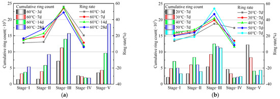 Similarly, when comparing the ring counts under different curing temperatures (Figure 13b), it was observed that with the increase in curing temperature, the cumulative ring counts in Stage I, Stage II, and Stage III initially increased and then decreased. This trend was consistent with the changes in strength. As the strength increased, more ring counts were accumulated before the peak in Stage IV, while the cumulative ring counts after the peak decreased. The proportions of ring counts in each stage followed the same pattern.