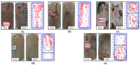 The failure morphology and AE location of the CPB with a curing time of 7 d: (a) 20 °C; (b) 30 °C; (c) 40 °C; (d) 50 °C; and (e) 60 °C.