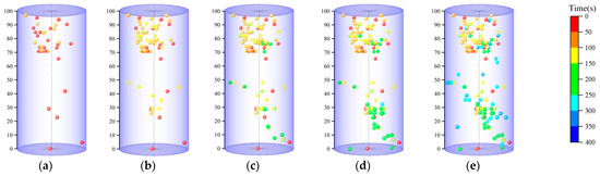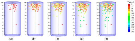 Temporal and spatial evolution characteristics of AE events in 40 °C—7 d: (a) Stage-I; (b) Stage-II; (c) Stage-III; (d) Stage-IV; (e) Stage-V.