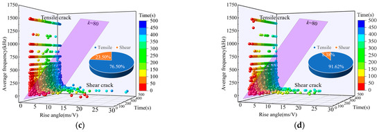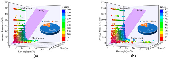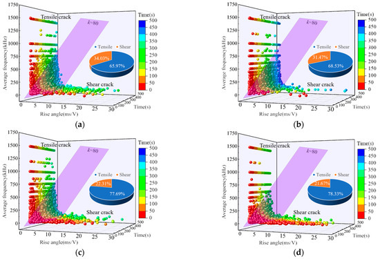 In the recommended standards by the Japan Concrete Association, the ratio of AF to RA was defined as the k value. Therefore, it was considered that AE events with AF/RA > k corresponded to tensile cracks, while AE events with AF/RA < k corresponded to shear cracks [36]. Based on the studies conducted by Ohno et al. [37], Aldahdooh et al. [38], and other scholars, a k value of 80 was chosen as the classification threshold for crack types. This threshold yielded highly accurate results, approaching the discriminative results obtained from the moment tensor method [39,40]. Therefore, this study was based on a k value of 80 to analyze the crack mechanisms of the CPB.