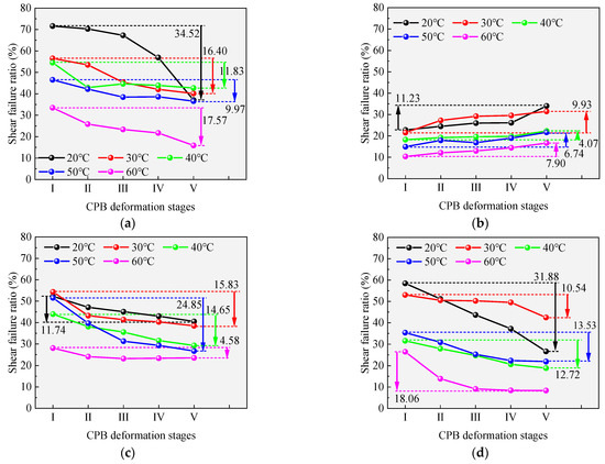 Analysis of shear failure ratio of CPB at different curing temperatures: (a) 3 d; (b) 7 d; (c) 14 d; and (d) 28 d.