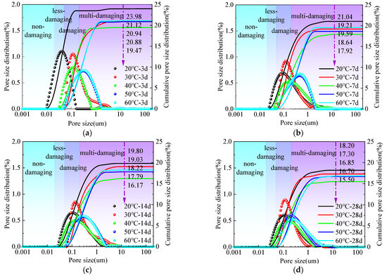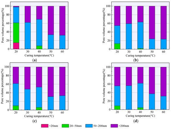 Distribution of pore volume percentage at different curing temperatures: (a) 3 d; (b) 7 d; (c) 14 d; and (d) 28 d.
