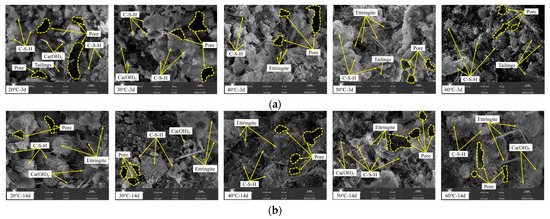 SEM analysis images: (a) curing time 3 d; and (b) curing time 14 d.
