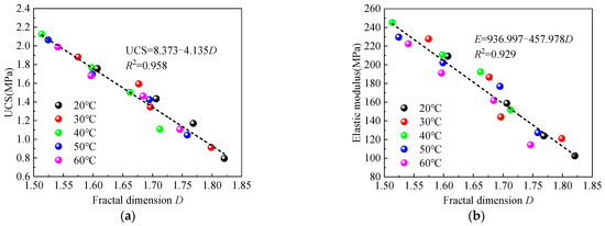 - The fractal dimension of the pores exhibited a strong linear correlation with the UCS and elastic modulus. When the pore fractal dimension decreases, it indicates that the microscopic compactness is stronger and the porosity is reduced, so the mechanical parameters are improved. The fractal dimension of the pores provided a reliable representation of the macroscopic mechanical properties.