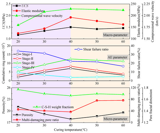 Considering the interrelationship between the macro and micro aspects of the CPB under various curing conditions, we examined the response of macroscopic, AE, and microscopic parameters at a curing time of 7 d. This analysis was conducted for different curing temperatures, as depicted in Figure 26.