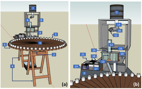 In the test case presented here, the predefined partial counter is set to 10 fragments (i.e., the collection of 1 fragment for every 10 that pass through the laser counter), and the total counter to 100 (i.e., the collection of 100 fragments in total or two fragments in each of the 50 cups). In this case, when the prototype is turned on and the feeder starts to vibrate, the fragments start to fall and the partial counter starts to count. When the 10th fragment passes through the laser, the deflector blade directs the fragment to the sample discharge which feeds the first plastic cup, and immediately the wheel motor turns the table, positioning the second cup below the sample discharge. Simultaneously, the partial counter informs the total counter that the count has reached 10. At this point, the total counter shows “1”, and the partial counter restarts counting from 0 until it reaches 10 again and collects the second fragment, when the total counter shows “2”. This procedure is repeated until the total counter reaches 100 (i.e., 100 fragments collected). At the end of this test, each of the 50 plastic containers should contain two fragments. Figure 2 shows the prototype performing a test with mineral fragments.