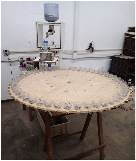 A lot of particulate material to be tested, belonging to a given size fraction, is placed inside the 10 L storage container. The prototype switch turns on the laser and the power supply. When turning on the power supply, the counters are activated, and the vibration starts so that the fragments are directed in line until the end of the vibrating feeder, which has a capacity of 0.4 L.