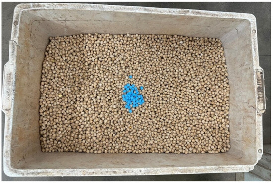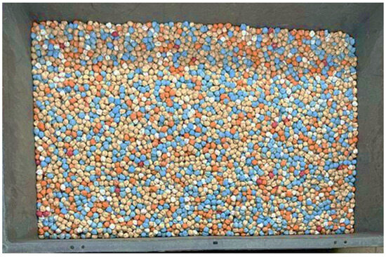 The second test performed was called “Test P” (for polymetallic mineralisation) and aimed to simulate a real polymetallic Cu-Pb-Zn deposit in Brazil. For this test, chickpea particles were painted by the mass (Figure 5). The mass of white particles was 2637.58 g, the orange particle mass was 3726.93 g, and the red particle mass was 260.44 g. Considering these masses, the estimated white “mineral” content was 10.36%, the orange “mineral” content was 14.64%, and the red “mineral” content was 1.02%. It is important to emphasise that, despite their appearance in the photograph, the blue particles are not part of the Test P.