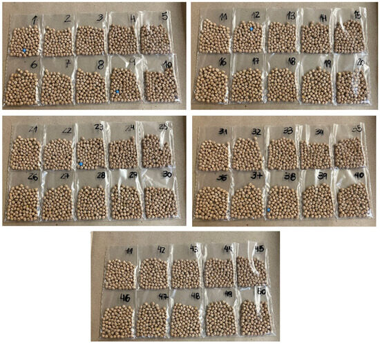 Test L was performed three times with the same primary lot. The tests were named L01, L02, and L03. Figure 4 shows the 50 chickpea subsamples generated by Test L01, with 1 blue particle in the subsamples number 1, 9, 12, 23, and 38. During the three tests, the feeder vibration was controlled according to the flow intensity, that is, when the movement of the particles in the feeder was slow, the vibration was increased, and when the movement was fast, the vibration was reduced. This procedure was carried out so that the flow was constant most of the time. The detailed results of Test L are presented in Appendix A.
