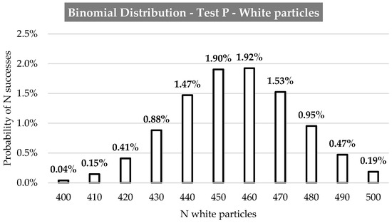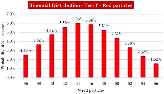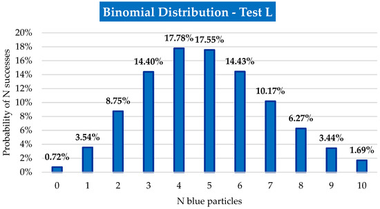 When a set of independent trials have probability of success and of failure, the results follow a binomial distribution [16]. For the tests carried out in this study, the particles have or do not have colour, so this is the distribution represented here.