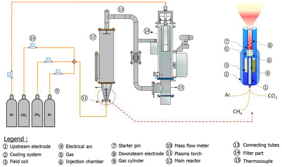 Argon gas (99 wt.% purity) was used to cool down the experiment, while pure CO2 (99 wt.% purity) and CH4 (99 wt.% purity) were used as plasma gases to generate a stable plasma arc. The experiment employed a molar gas ratio CO2/CH4 of 1:1. Each experiment was fed with Al2O3 (98 wt.%), Fe2O3 (98 wt.%), Fe3O4 (98 wt.%), and TiO2 (98 wt.%).