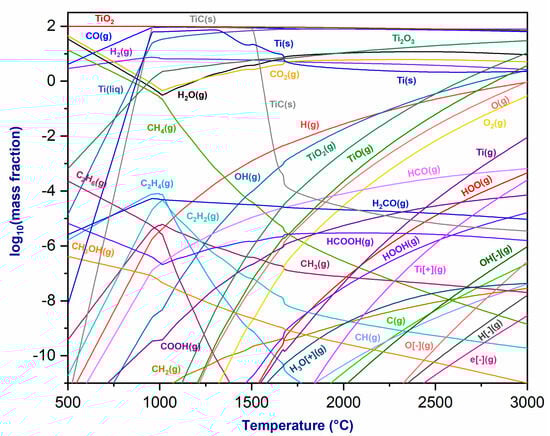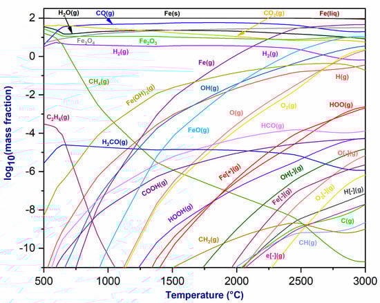 Three databases, namely FactPS, FToxid, and FSstel, were selected to encompass the solid and gas species produced in the total reaction of the torch gases outlet and oxides (Al2O3, TiO2, Fe2O3, and Fe3O4). All gaseous, liquid, and solid species were carefully chosen for thermodynamic calculations, including all potential solutions. Overall, 167 species and 9 solutions were applied for Al2O3, 168 species and 16 solutions for TiO2, and only 147 species and 11 solutions for Fe2O3 and Fe3O4. The figures below emphasize species with a large mass fraction. Only species with a log (mass fraction) ≥ −11 are included in the figures.