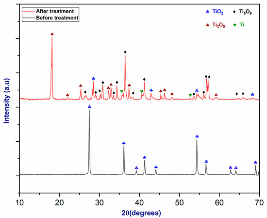 Figure 9 shows an XRD diffractogram of TiO2 before and after plasma treatment. Diffraction peaks at 27°, 36°, and 55° in XRD patterns indicate the existence of TiO2’s rutile phase, as proven by complete agreement with the reference spectrum [40]. However, plasma exposure resulted in the formation of other oxidized forms of rutile, such as Ti3O5 and Ti5O9. This would indicate a partial reduction in TiO2 within the plasma reactor. Particular regions showed a further reduction, resulting in the production of titanium metal, as shown by the presence of matching peaks [41].